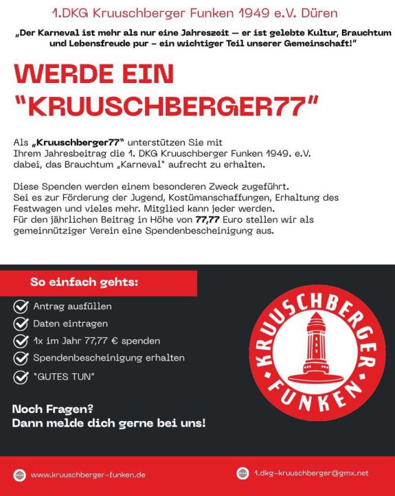 Da die 1. DKG Kruuschberger Funken 1949 e.V. ausschließlich geimeinnützig handelt, sind Geldspenden in jegllicher Form zu 100% steuerlich absetzbar!